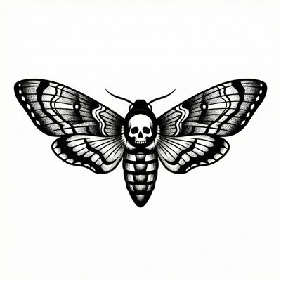 Hülle dich in eine Aura von düsterer Romantik und geheimnisvoller Eleganz. Dieses kunstvolle Design eines Totenkopfschwärmers im klassischen Blackwork-Stil ist eine Hommage an die Schönheit der Nacht und die stetige Wandlung.