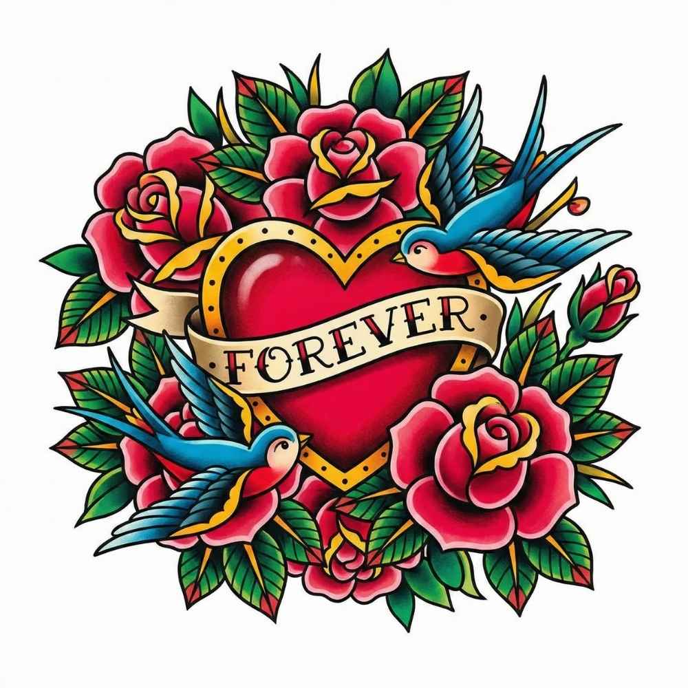 Klassisches Herz im Old School Stil, umgeben von blühenden Rosen und zwei Schwalben, gekrönt von einem Banner mit dem Schriftzug „FOREVER“.